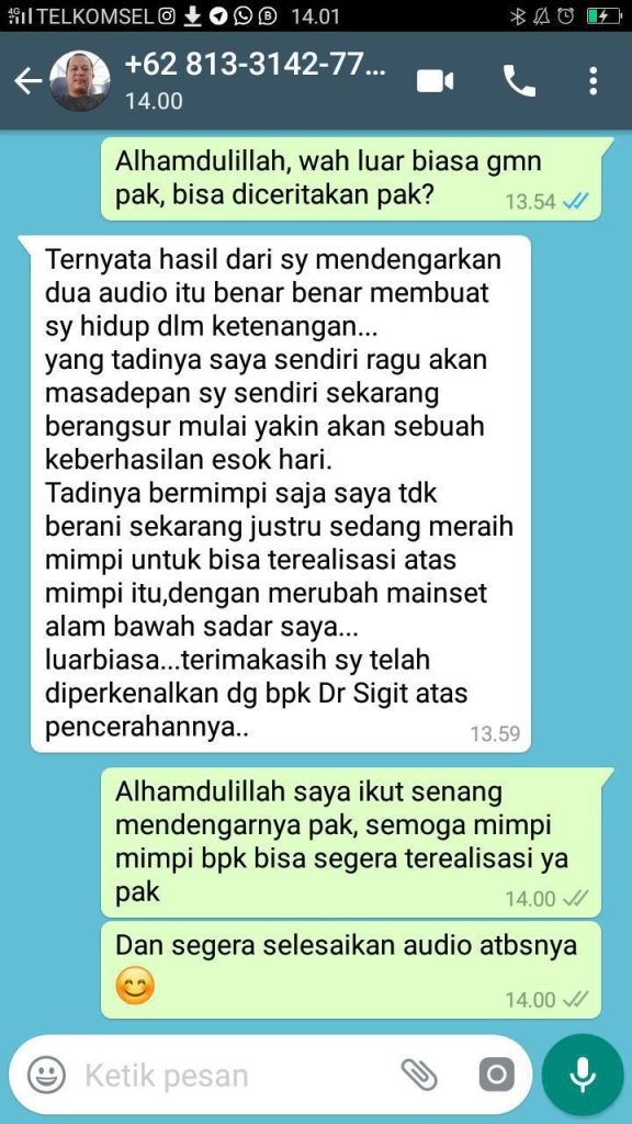 Di kelas bimbingan BEST HOPE, Mentor Utama Dr Sigit Setyawadi, Sp.OG dengan tulus menciptakan Audio Terapi Bawah Sadar yang memberi sugesti kehidupan sejahtera dan bahagia untuk membantu seluruh peserta kelas bimbingan BEST HOPE tanpa mengharapkan imbalan apapun karena niat beliau dan segenap tim admin adalah membantu sebanyak – banyaknya orang meningkatkan plafon rezeki mereka. Peserta hanya perlu mendengar audio yang diberikan berulang – ulang sampai minimal 21X. Kalau bisa lebih dari 21X malah lebih baik.