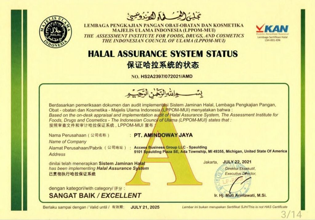 Amway telah memperbarui Sertifikat Halal di tahun 2021 – 2025. Buat yang masih meragukan produk produk Amway, apakah HALAL atau tidak. Kini.. anda tidak perlu ragu lagi. Semua Produk Amway juga sudah terdaftar di BPOM.